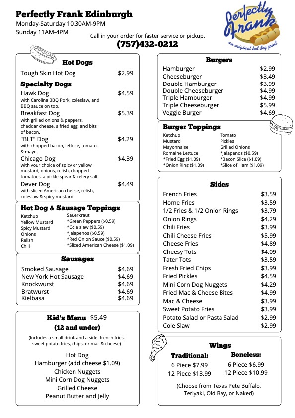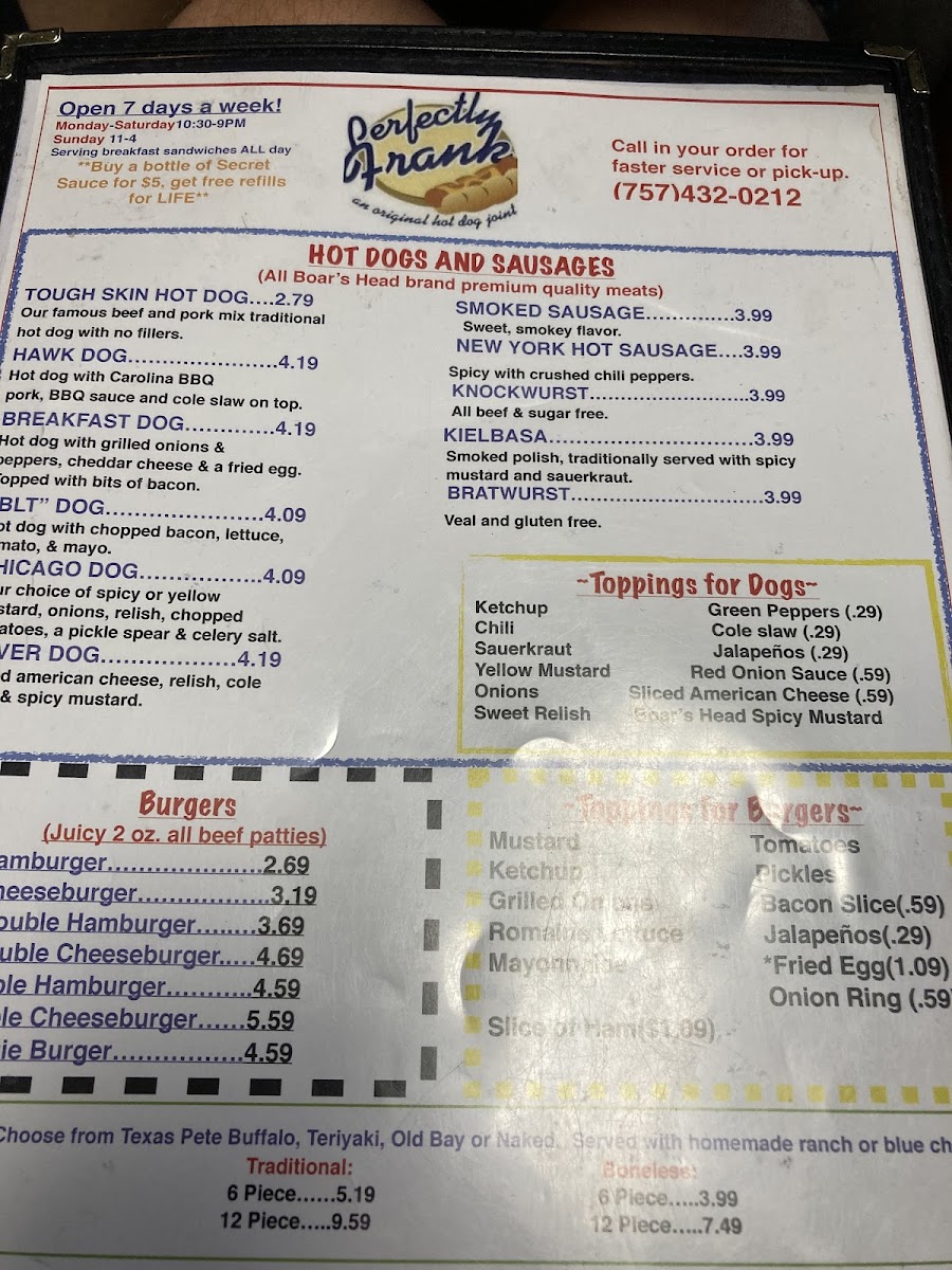 Introducing the menu at Perfectly Frank, located in the heart of Chesapeake, VA, where comfort food takes center stage. Their hot dogs, like the Tough Skin Dog for just $2.99, are a testament to their commitment to quality and flavor. Burgers are equally enticing, featuring a range from classic hamburgers to double cheeseburgers, all reasonably priced between $2.99 and $5.99.